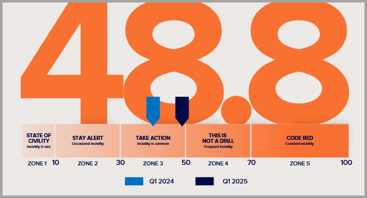 At the start of 2024, the Society for Human Resource Management (SHRM) decided to track the pulse of civility across the United States. The Civility Index report grades the state of civility (see below) with the 1st quarter of 2025 receiving a 48.8 grade, a 6.5% increase from the same time the year before.