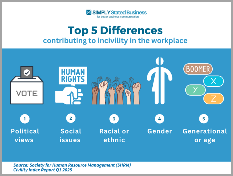 The SHRM report cites the Top 5 Contributors to Incivility in the Workplace as a result of the following differences.